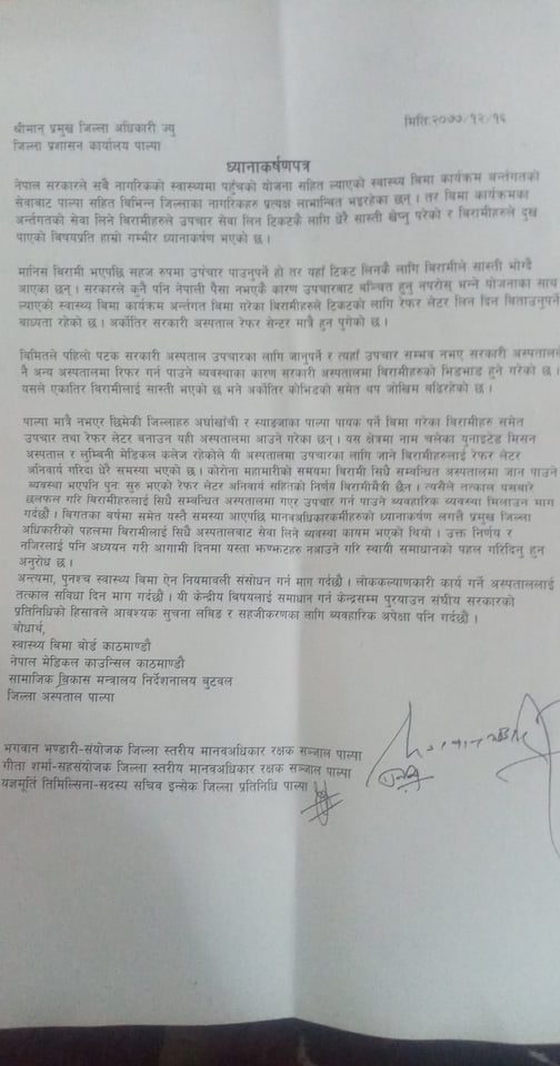पाल्पा । पाल्पामा स्वास्थ्य बीमाको सुविधा लिदा सास्ती खेप्दै आएका नागरिकको पिडालाई सरोकारवाला निकायले प्रमुख जिल्ला अधिकारीमार्फत ध्यानकर्षण पत्र बुझाएको छ ।