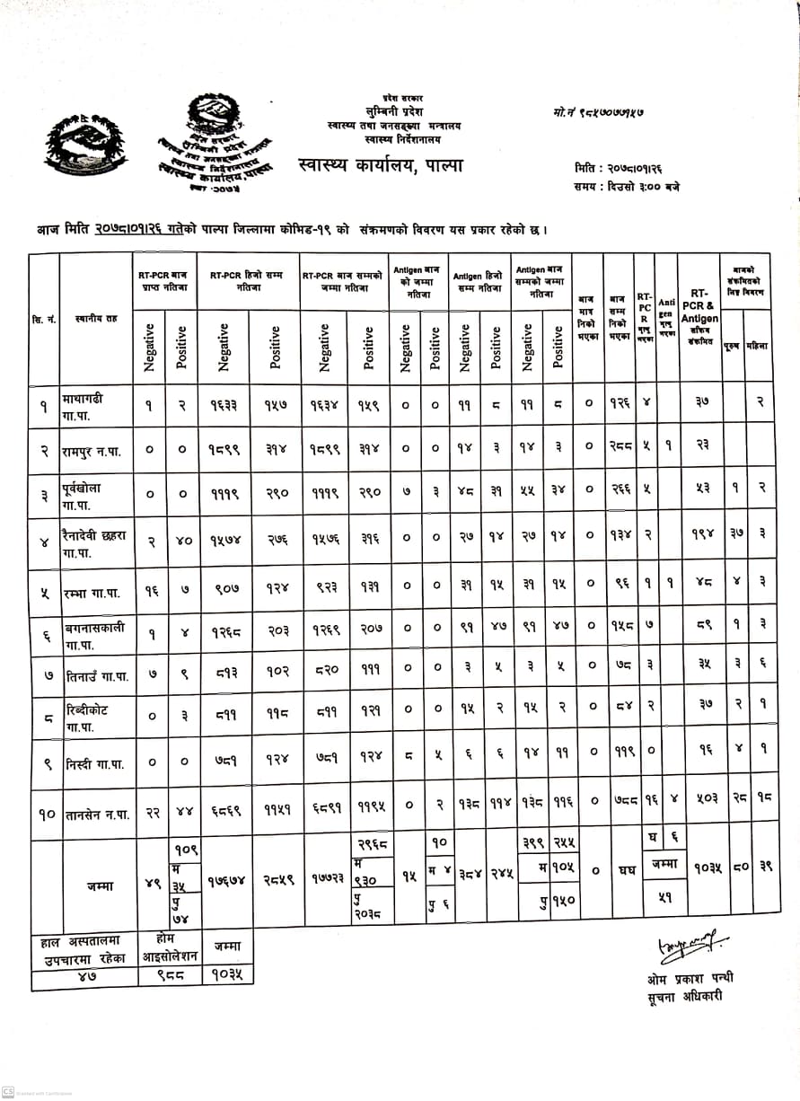 स्वास्थ्य कार्यालय पाल्पाले दिएको जानकारी अनुसार पिसिआर र ऐन्टिजेन परीक्षण थप ८० जना पुरुष तथा ३९ जना महिलामा संक्रमण पुष्टि भएको हो ।