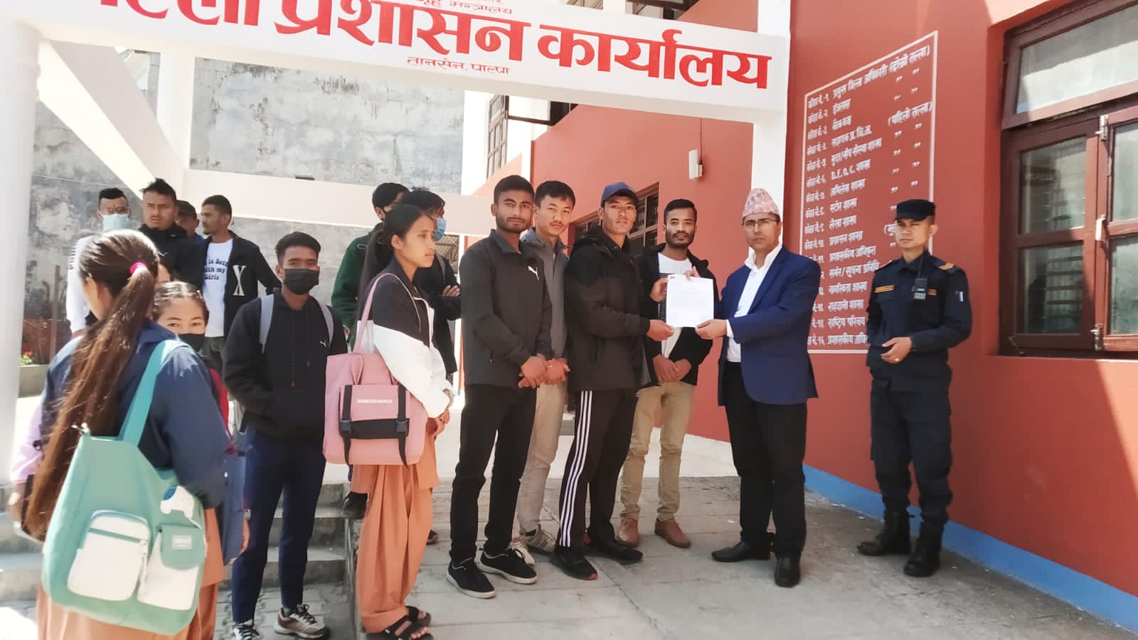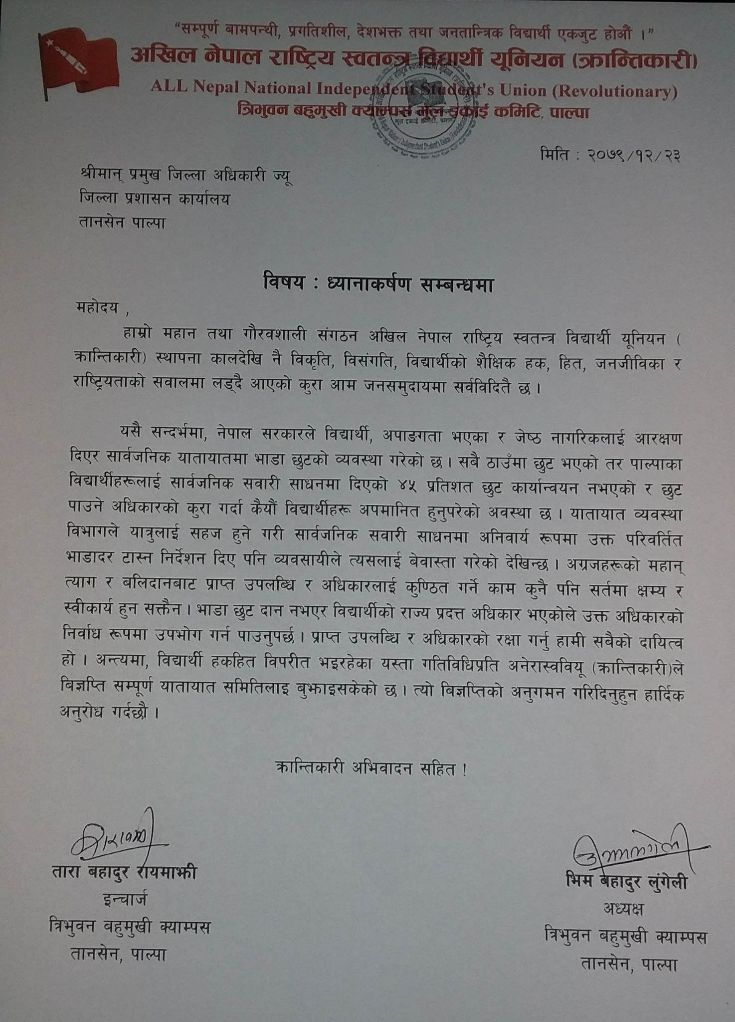 बिहीबार पाल्पा जिल्लाभर सञ्चालन हुने सार्वजनिक सवारीसाधनले विद्यार्थीलगायत अन्य अन्य लक्षित वर्गका नागरिकले ४५ प्रतिशत भाडामा छुट दिनुपर्ने प्रावधान उल्लङ्घन गरेको भन्दै प्रमुख जिल्ला अधिकारी बन्धुप्रदास बास्तालालाई ज्ञापनपत्र बुझाएका छन् ।