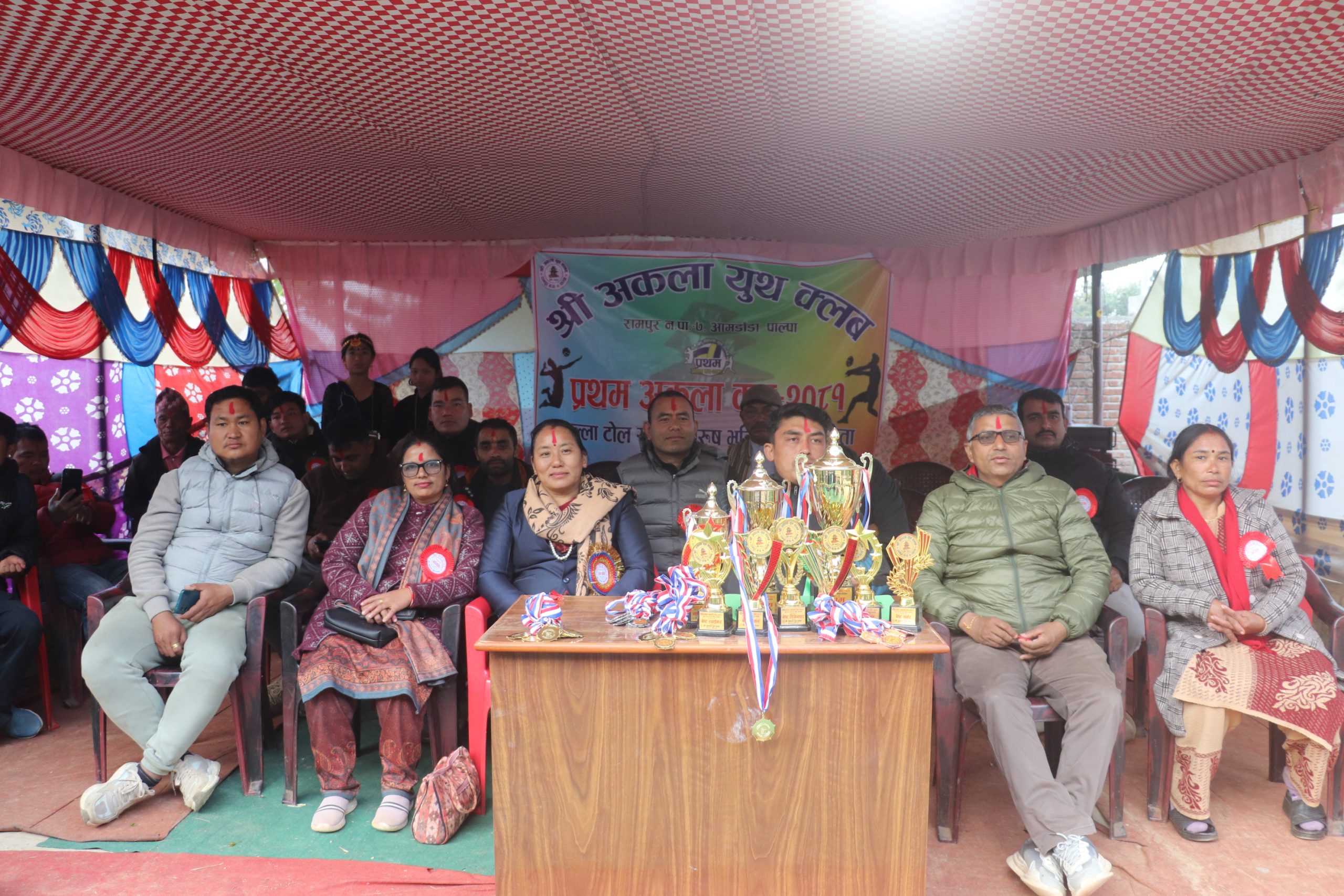 तानसेन। प्रथम अकला कप २०८१ अन्तर्गत खुल्ला टोल स्तरीय पुरुष भलिबल प्रतियोगिता रामपुर ७ आमडाँडा पाल्पामा मंगलबार सम्पन्न भएको छ । अकला युथ क्लव रामपुर ७ आमडाँडा पाल्पाको आयोजनामा भएको प्रतियोगिताको उपाधि मोहमी युवा क्लव चापाकोट ६ स्याङ्जाले जितेको छ ।